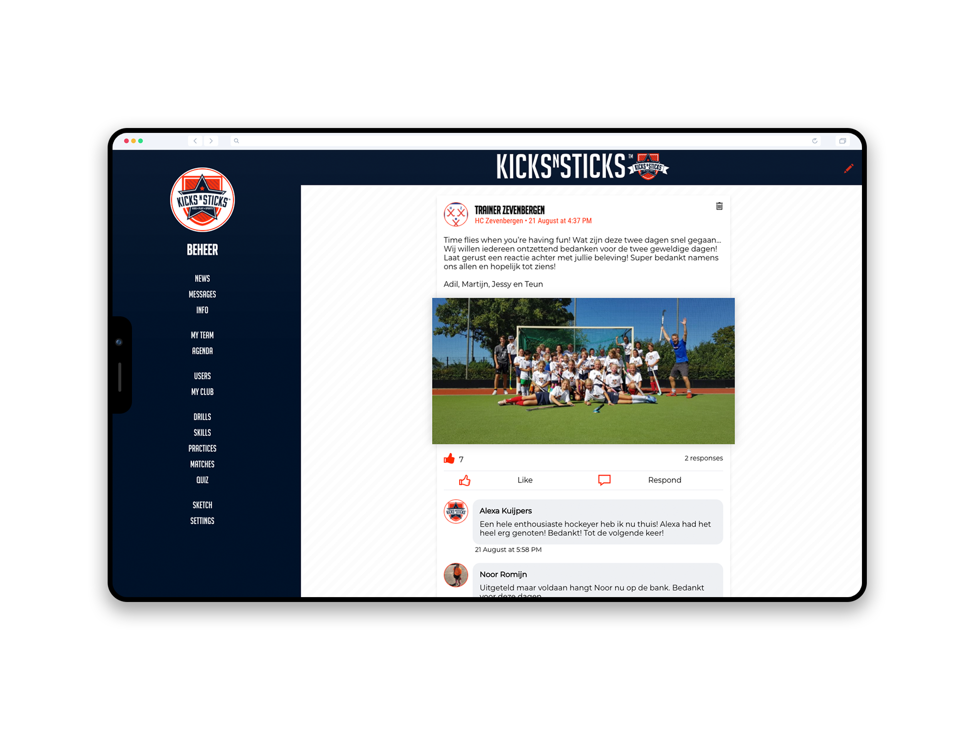 Korte omschrijving: Kicks ‘n Sticks is een volledig interactief team management platform voor spelers, trainers/coaches en ouders. Het platform bevat een spelervolgsysteem, oefenstofdatabase en uitgebreid teambeheer. Daarnaast maakt het platform gebruik van gamification. Hiermee worden spelers op een leuke en speelse manier gestimuleerd om thuis oefeningen uit te voeren via de app.