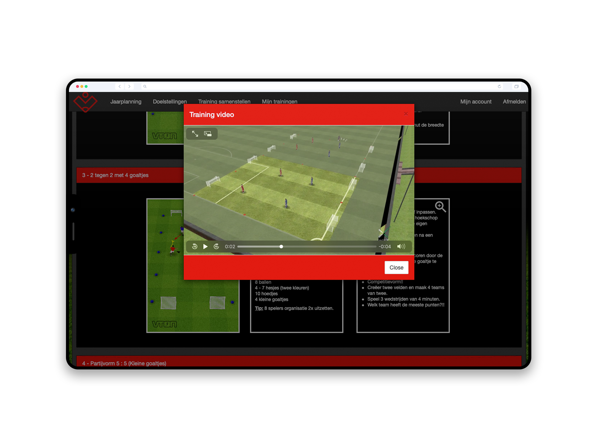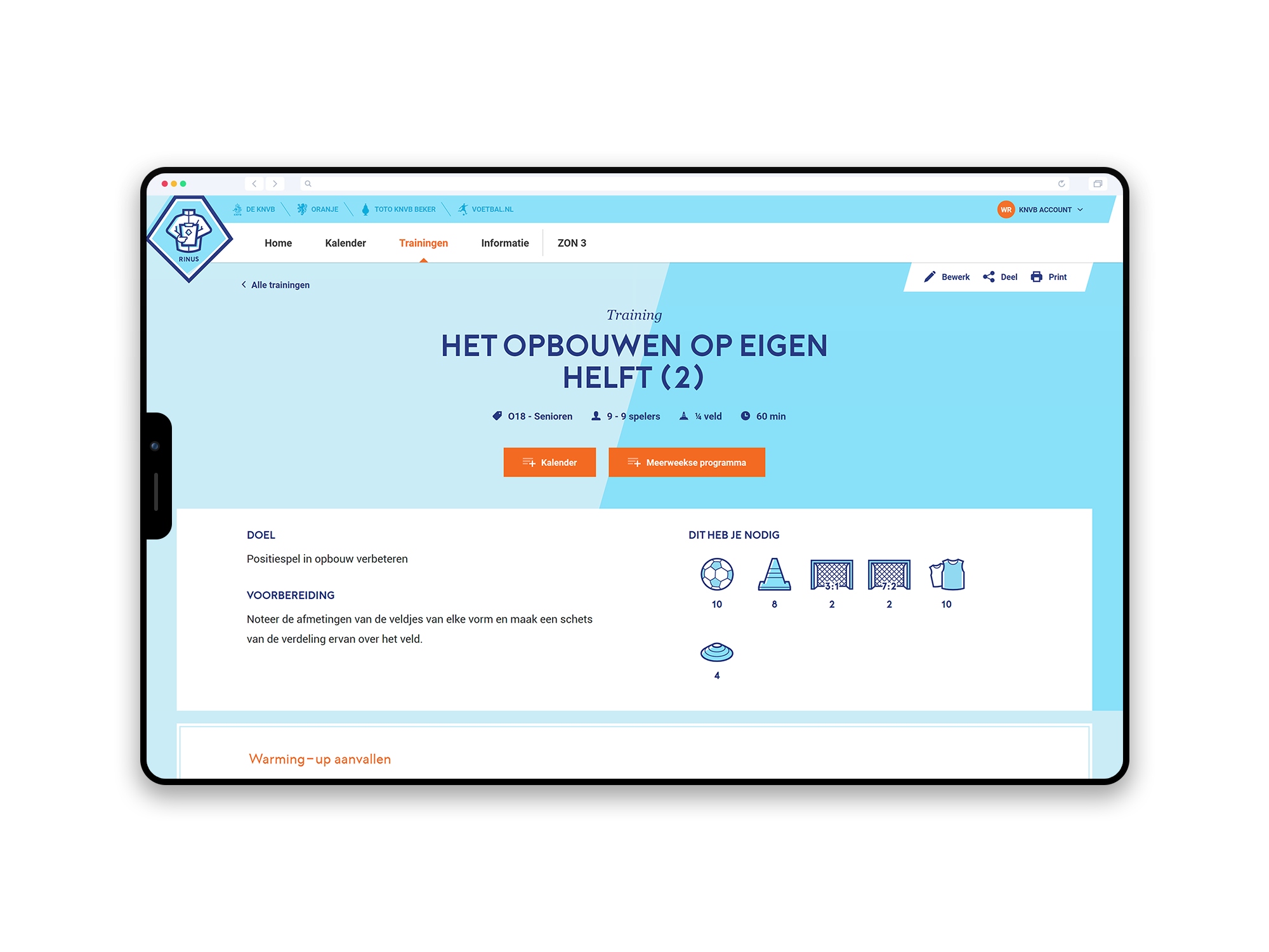Functionaliteiten: Complete jaarplannen (leerlijnen, trainingen, trainingsweken, oefeningen, coach-doelen) per leeftijdscategorie (klaar en zelf aan te passen). Tactische en technische vaardigheden volledig in beeld gebracht. Delen via de app of via what’s app met wie je wilt. Bijhouden van presenties. Sponsor-activatie in het platform. Mogelijkheden voor het personaliseren van de look&feel. Zelf uploaden van bestanden, filmpjes etc. Zelf toevoegen van taglists, thema’s etc. Specifieke rapportages over de inzichten in het gebruik. White-label mogelijkheid voor andere sporten / bonden / koepelorganisaties.