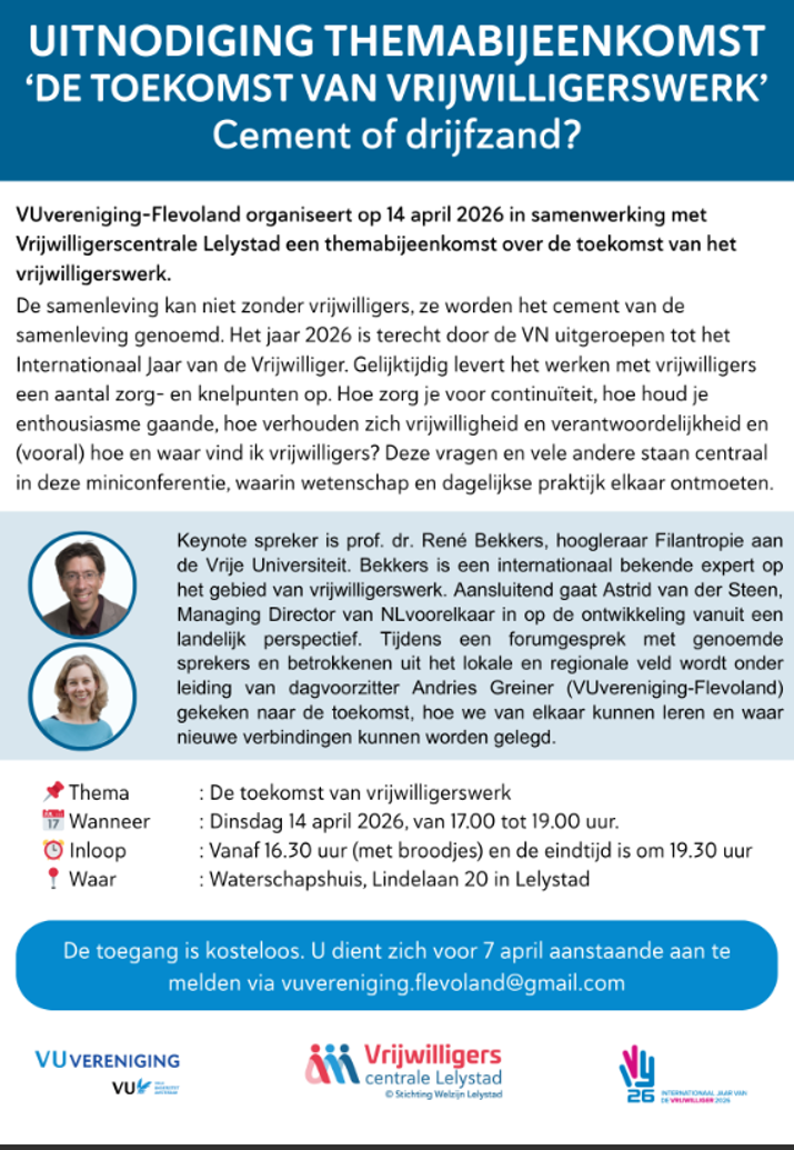 Namens onze partner Welzijn Lelystad nodigen we je graag uit voor een inspirerende bijeenkomst over de toekomst van vrijwilligerswerk op dinsdag 14 april. Deze themabijeenkomst wordt georganiseerd door de VUvereniging-Flevoland, in samenwerking met Vrijwilligerscentrale Lelystad. Thema: De toekomst van vrijwilligerswerk – cement of drijfzand?