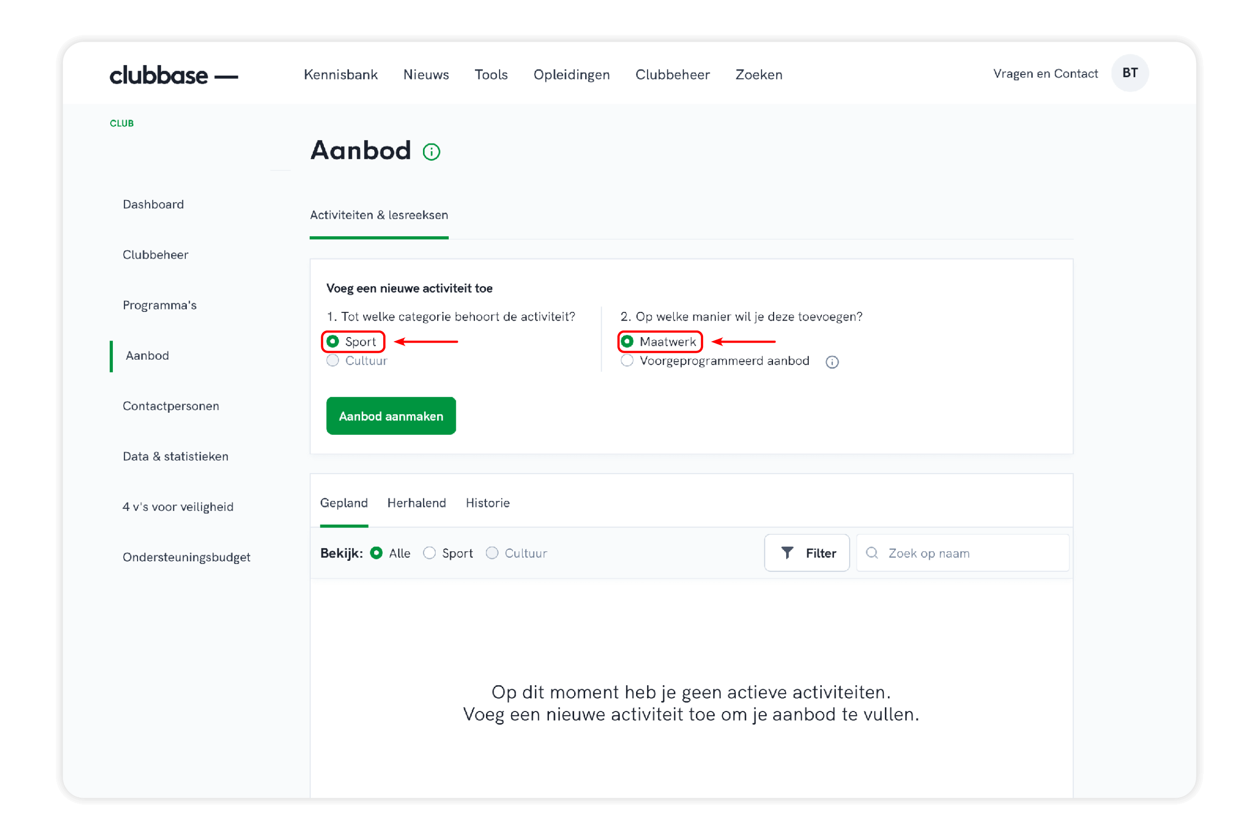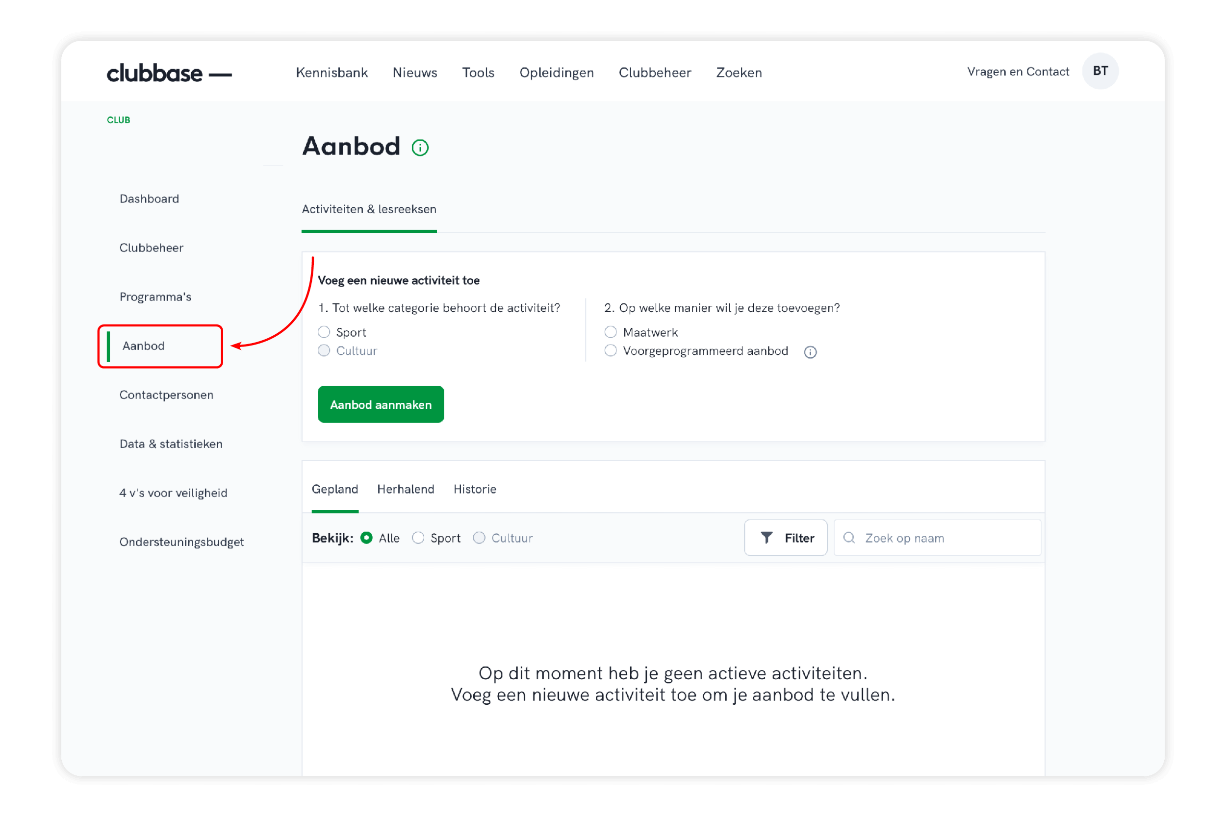 Vanuit het Dashboard van Clubbeheer kies je voor 'Aanbod' om activiteiten aan te maken.
