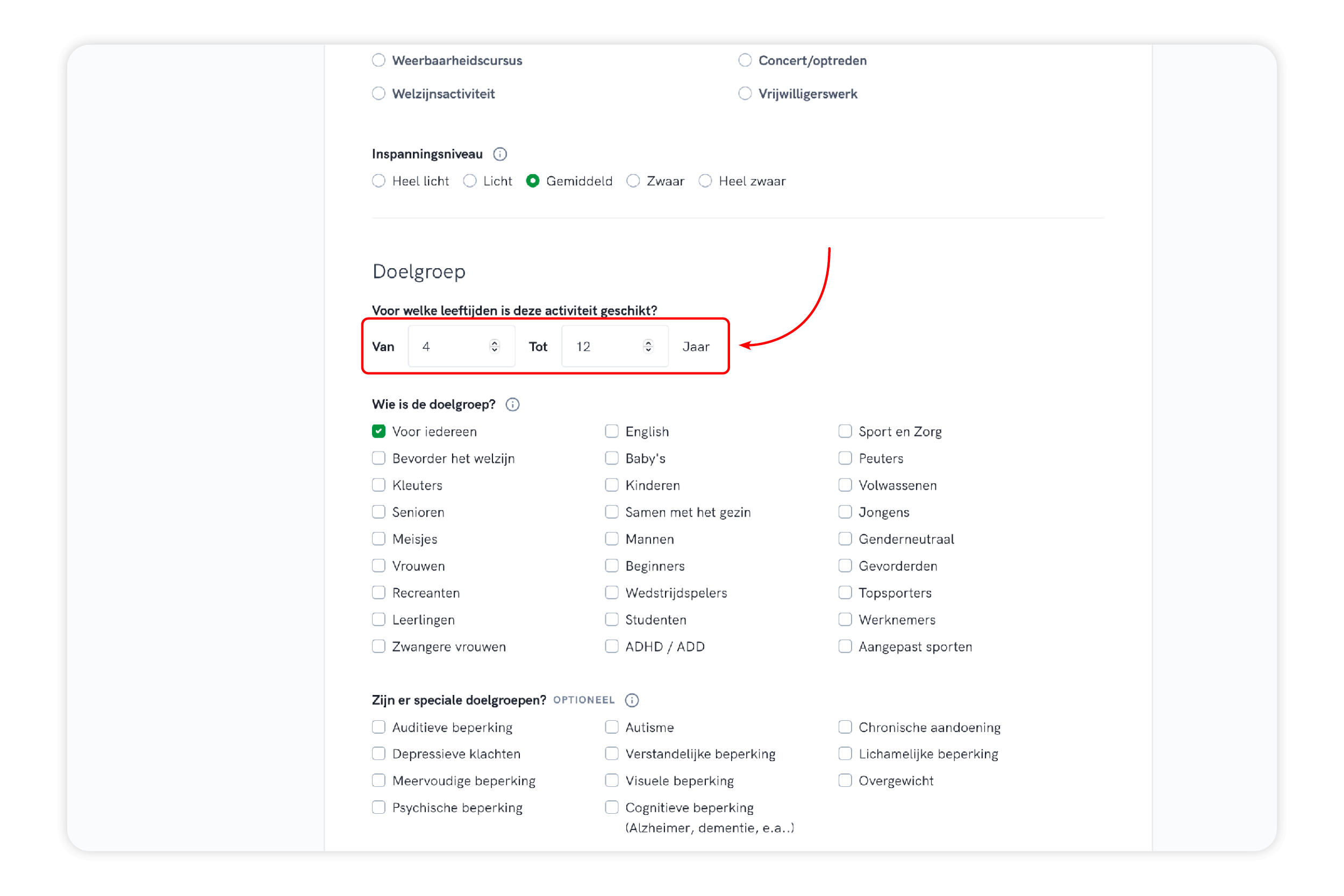 Is je activiteit specifiek gericht op een speciale doelgroep? Bijvoorbeeld kinderen met overgewicht? Dan geef je dit aan bij 'Zijn er speciale doelgroepen'.