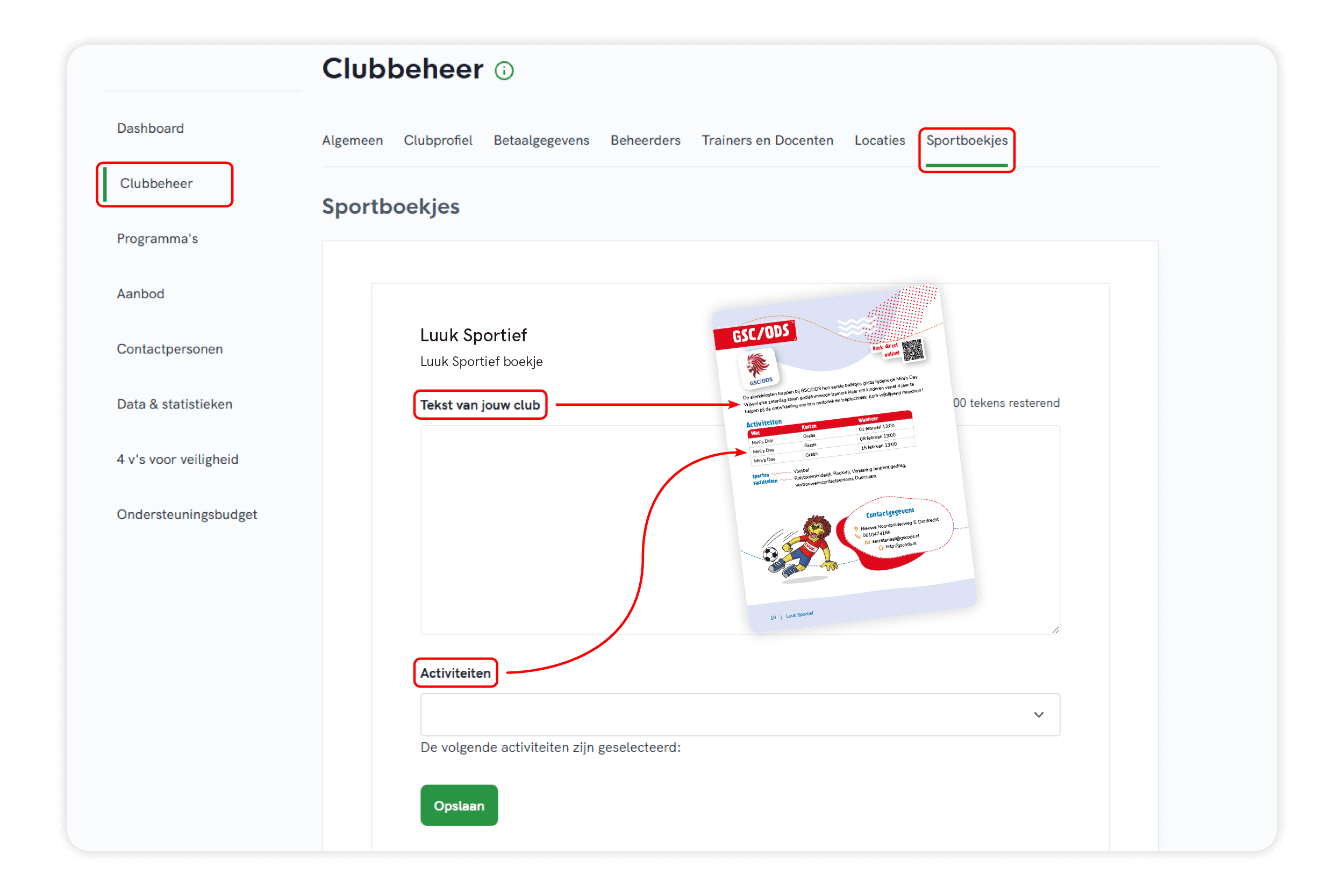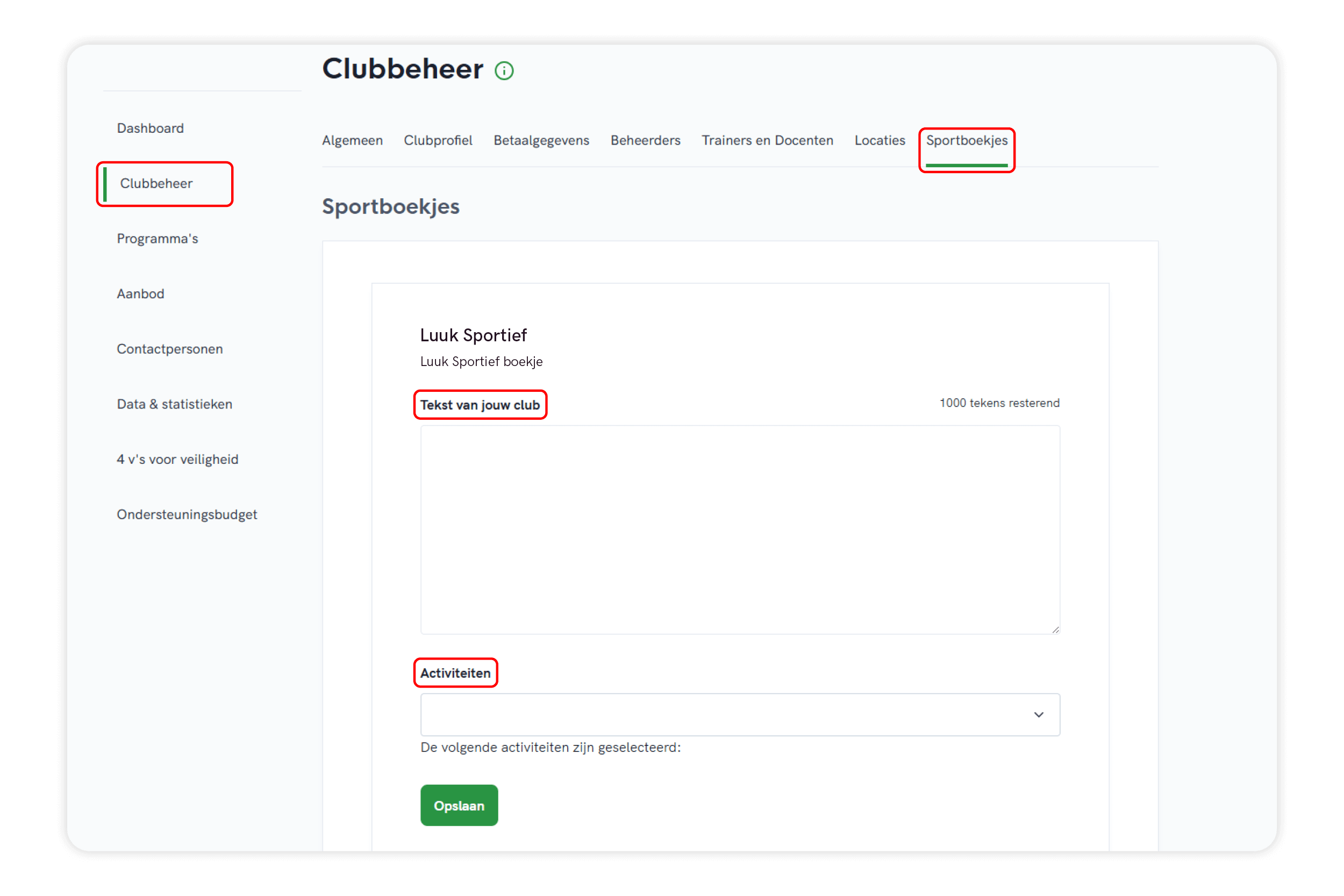 Op het tabblad 'Sportboekjes' voer je informatie in over jouw club. Welke kinderen zouden jouw club écht moeten ontdekken? En wat maakt jullie zo'n leuke club? Schrijf dit kort op bij 'Tekst van jouw club'.