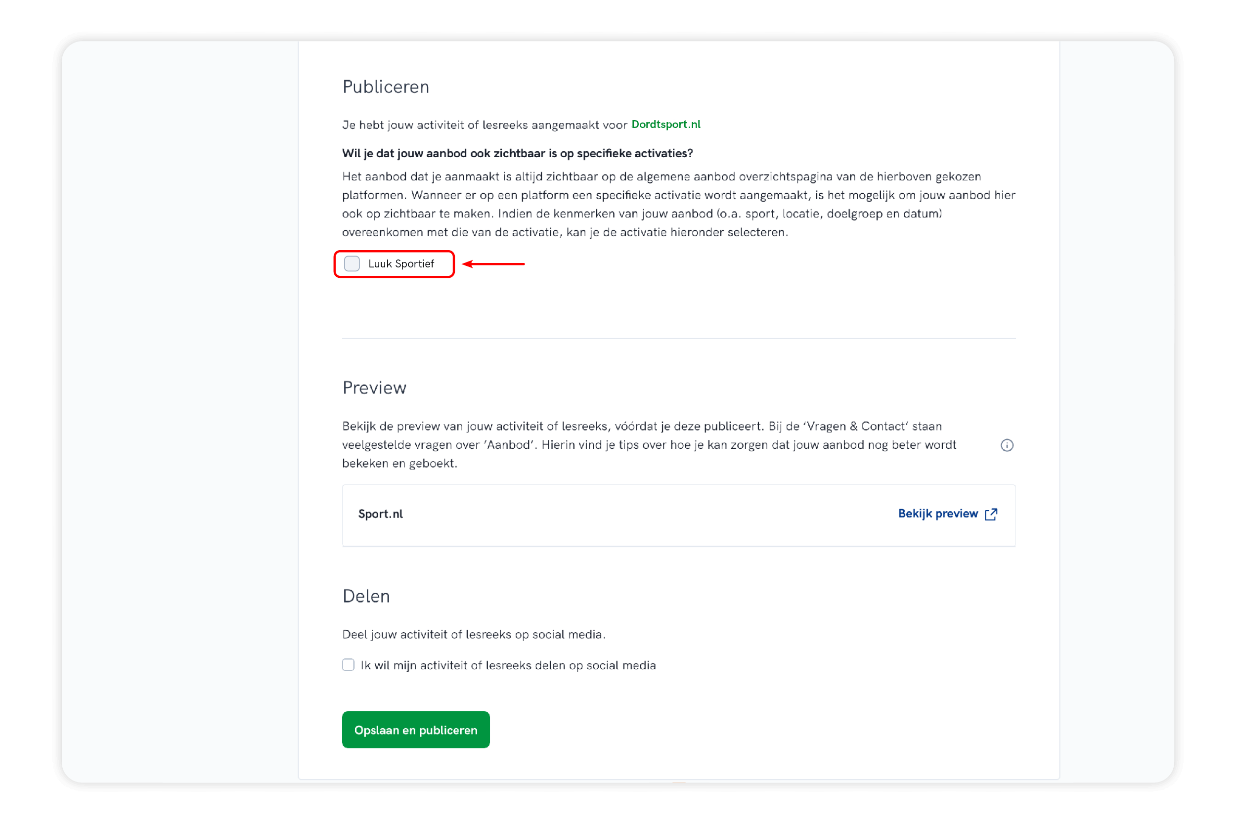 Klik nadat je 'Luuk Sportief' hebt aangevinkt op 'Opslaan en publiceren'. Je aanbod is nu online zichtbaar bij Luuk Sportief.